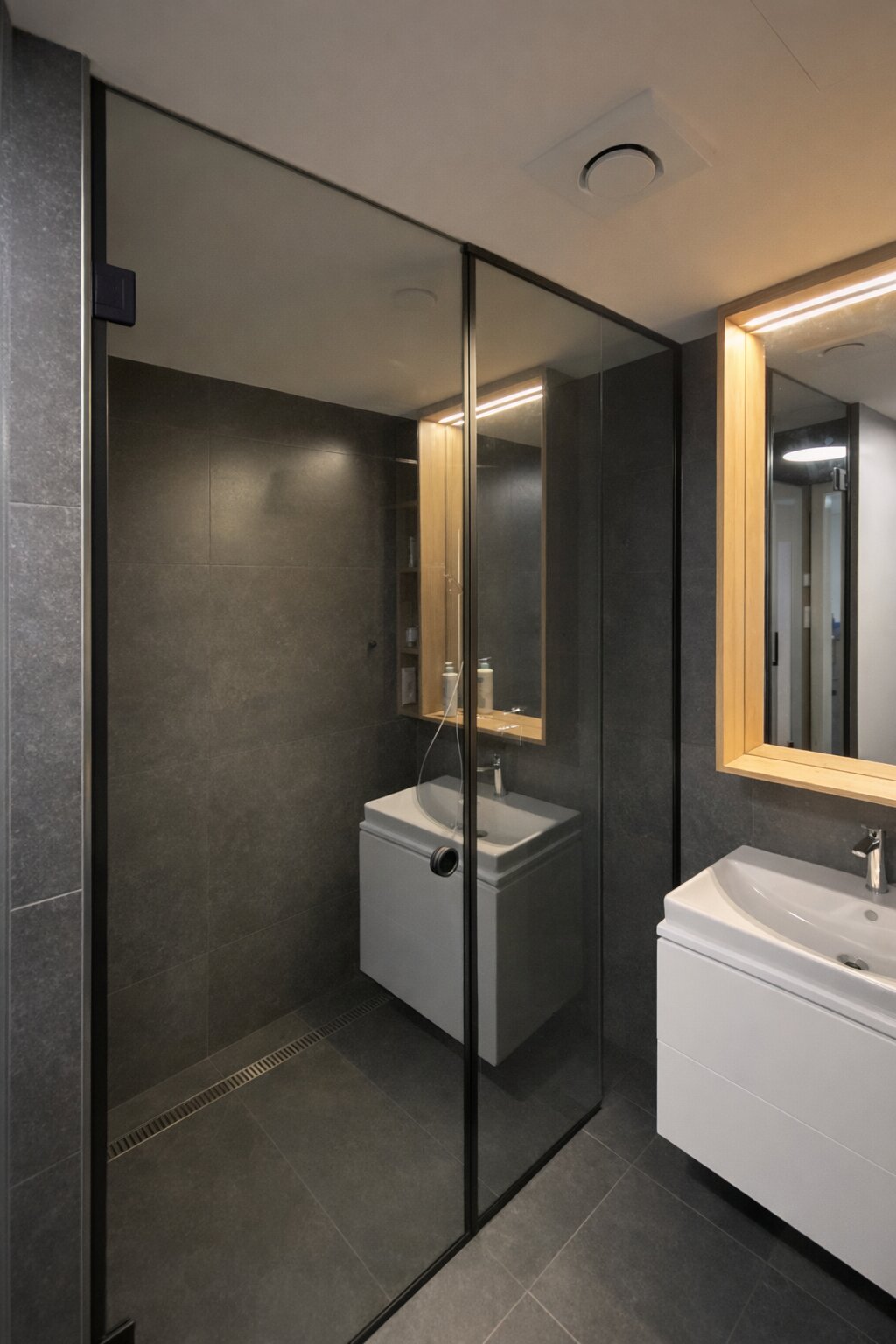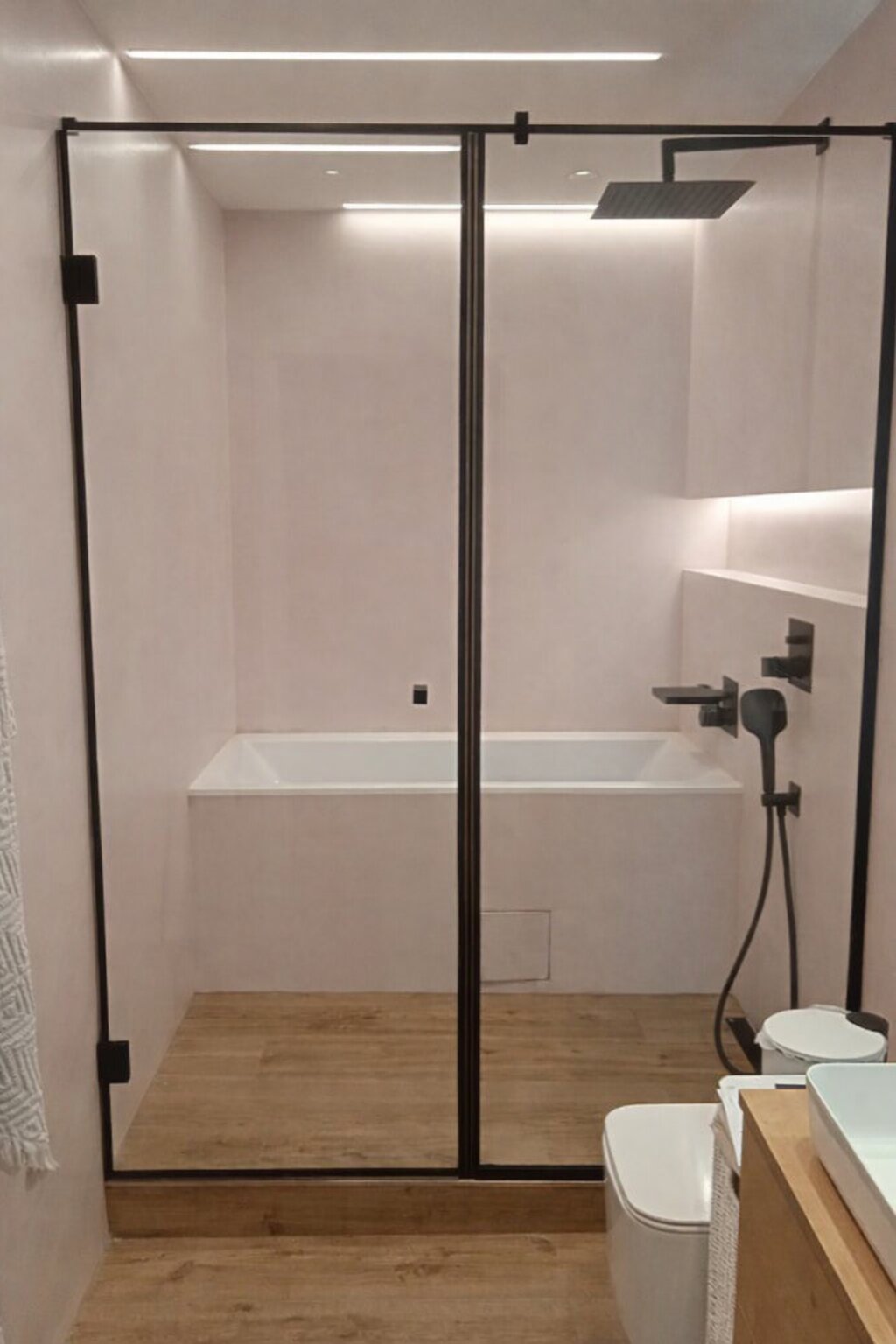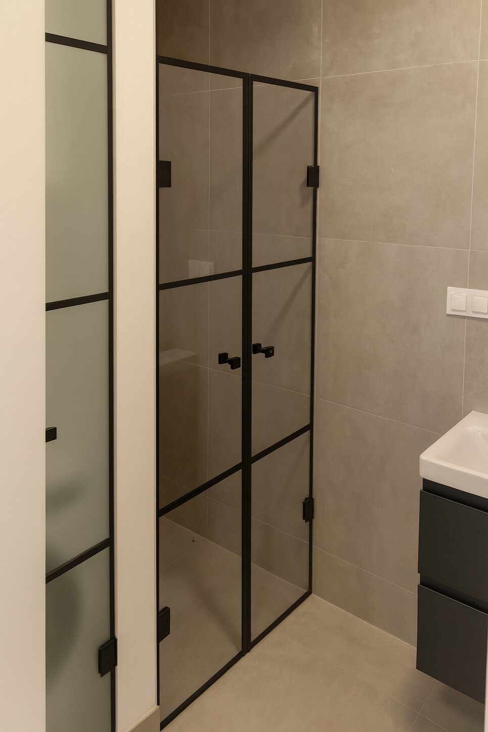 Sprchové kouty s černými rámečky ukazují, že i výrazný detail může zásadně ovlivnit atmosféru celé koupelny. Nejde o efektní gesto, ale o promyšlené řešení, které dává prostoru jasnou strukturu.